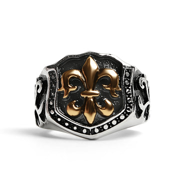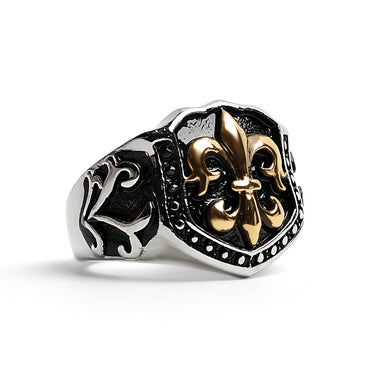Rostfritt stål 18K Gold PVD -belagd Fleur de Lis Shield Signet Ring / SCR4034