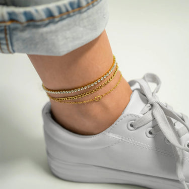 Utstråla elegans med denna 18K guld PVD rostfritt stål anklet. Innehåller ett delikat arrangemang av skimrande stenar som lägger till en subtil men fängslande gnistra till varje steg. Perfekt för att förbättra avslappnade utseenden, speciella tillfällen eller gåvor till någon som älskar tidlösa accessoarer.