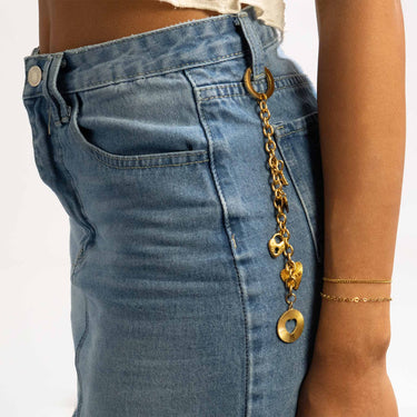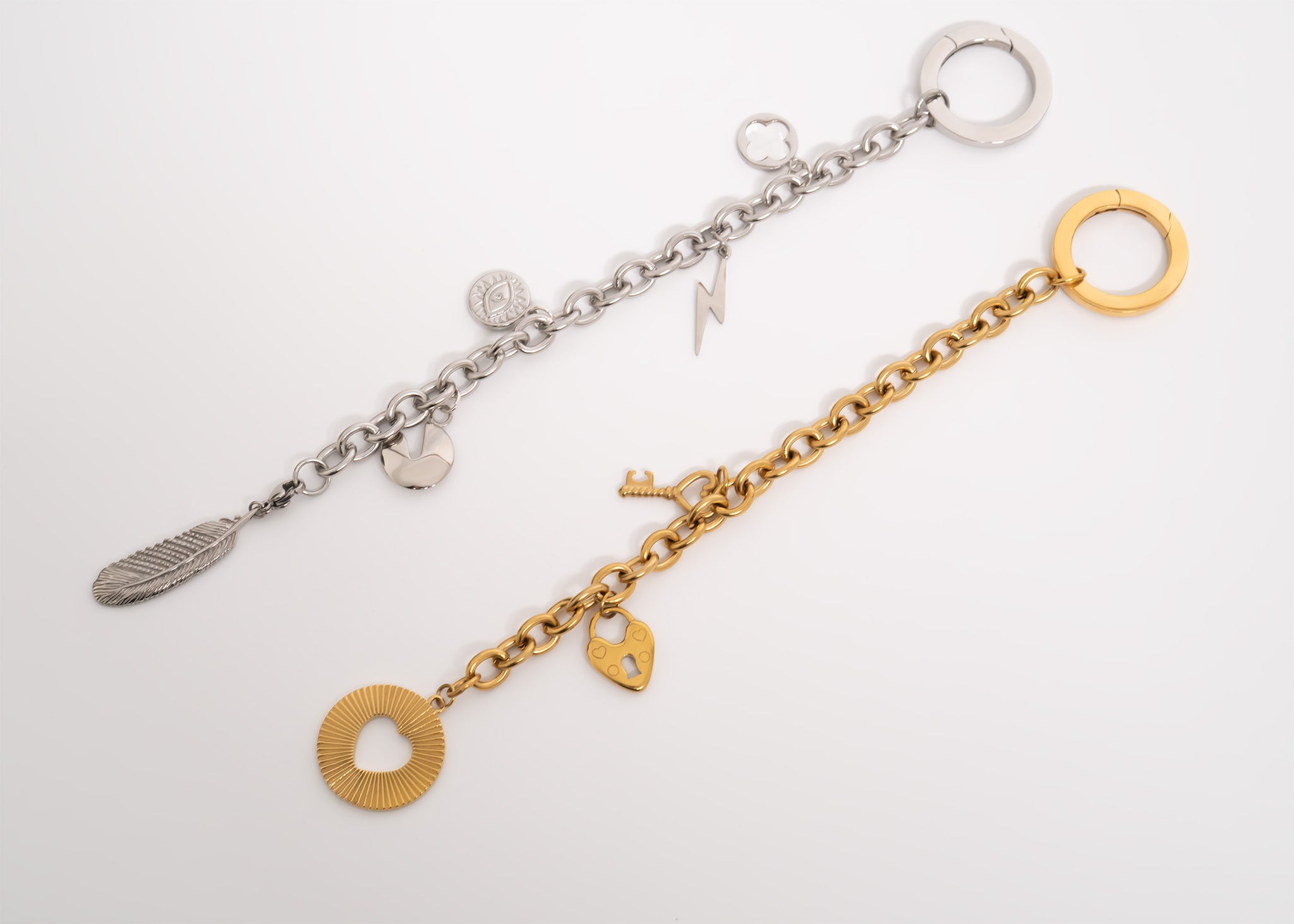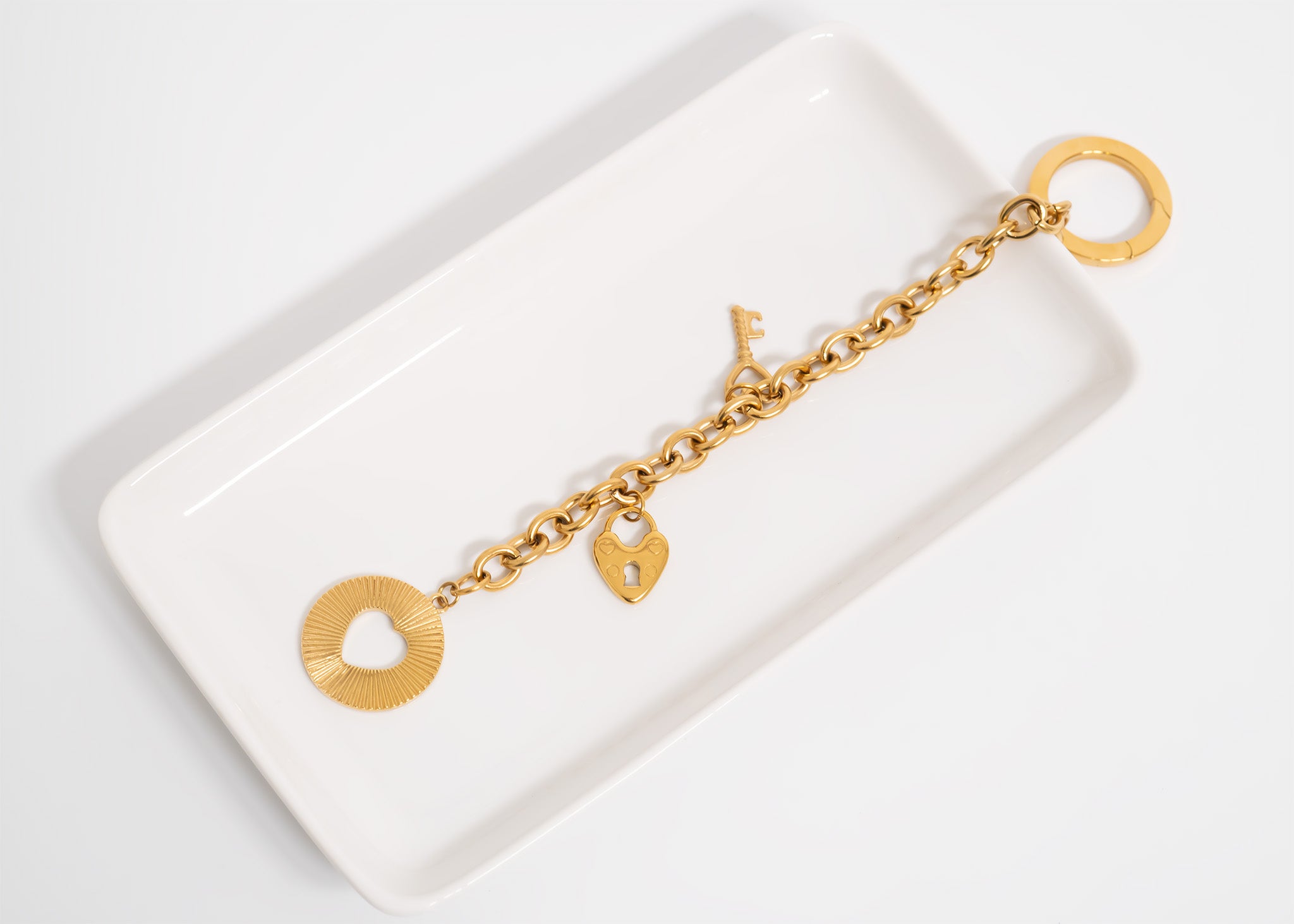 Elevate your everyday essentials with this stylish charm key chain. Crafted from durable stainless steel and finished in radiant 18K gold PVD, it features a sleek round clasp that makes attaching charms effortless. Perfect for keys, bags, or as a statement accessory on the go, this key chain brings both function and flair.