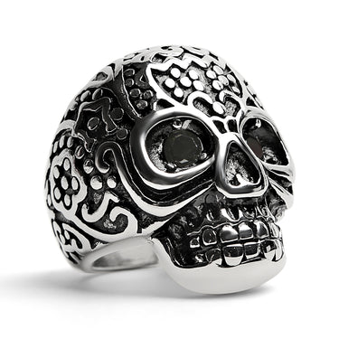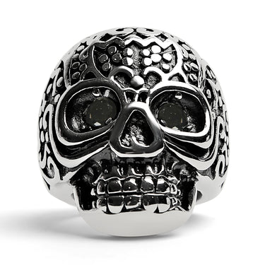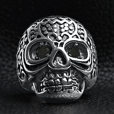 Stor detaljerad skalle svart CZ -ögon rostfritt stål ring / SCR4002