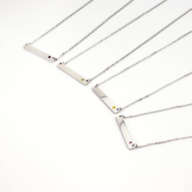 Skapa den perfekta färdiga att sälja Birthstone Bar Halsband display med vår Rostfritt stål Birthstone Bar Halsband Set & Halsband Display! Denna utvalda uppsättning halsband inkluderar 5 graverbara barhalsband i rostfritt stål med en födelsesten i cubic zirconia för var och en av de 12 månaderna, för totalt 60 halsband, plus en halsbandsdisplay.